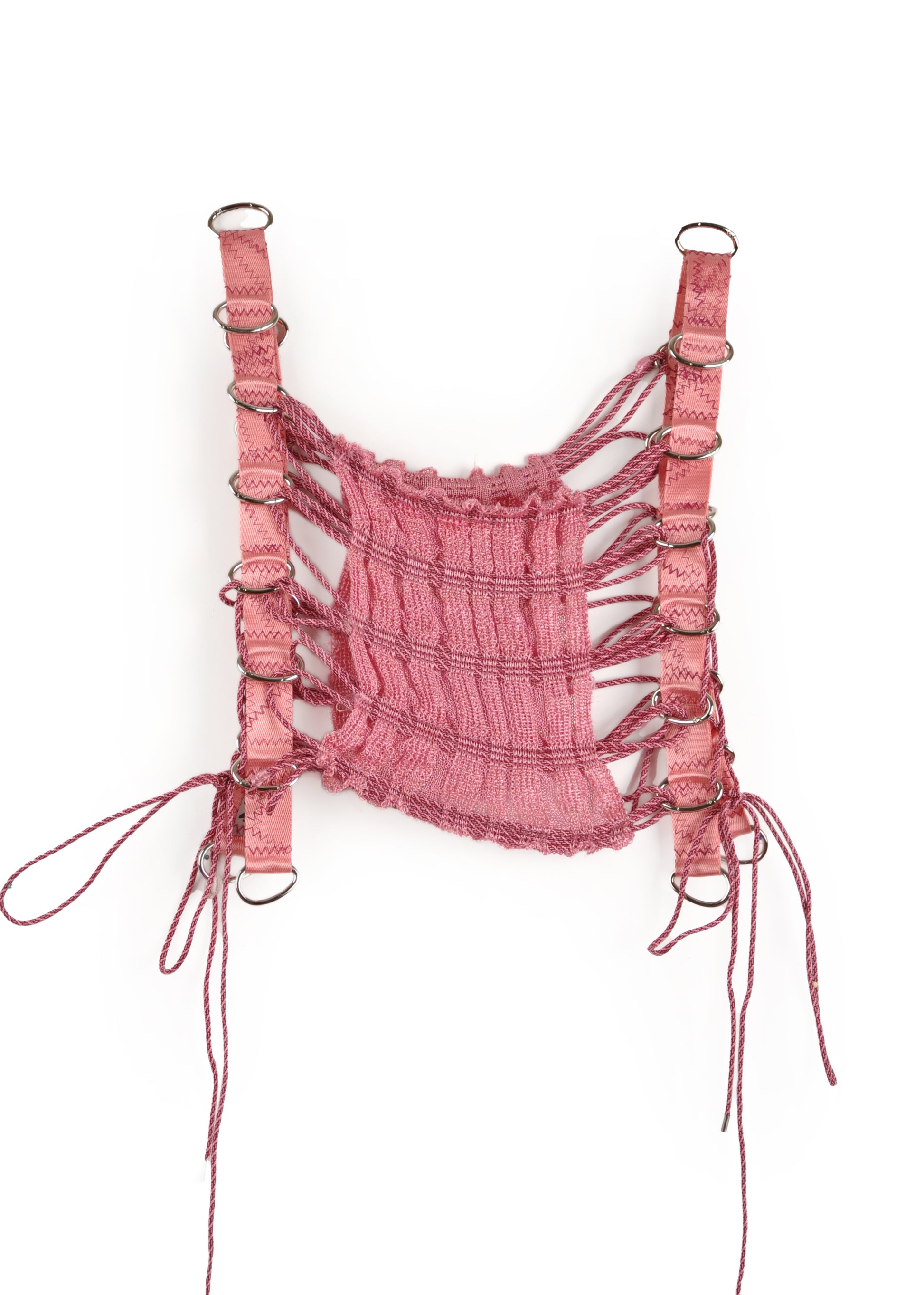 Dieses rosafarbene Oberteil ist ein einzigartiges Design, handgefertigt aus Restgarnen. Das Gestrick ist anpassbar, sodass Länge und Silhouette individuell gestaltet werden können .