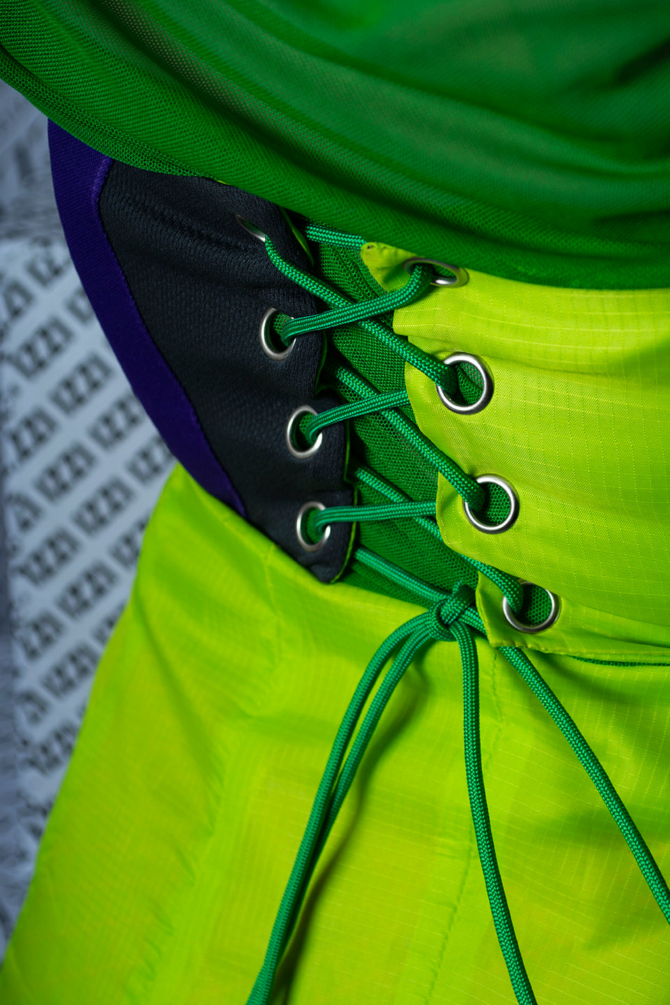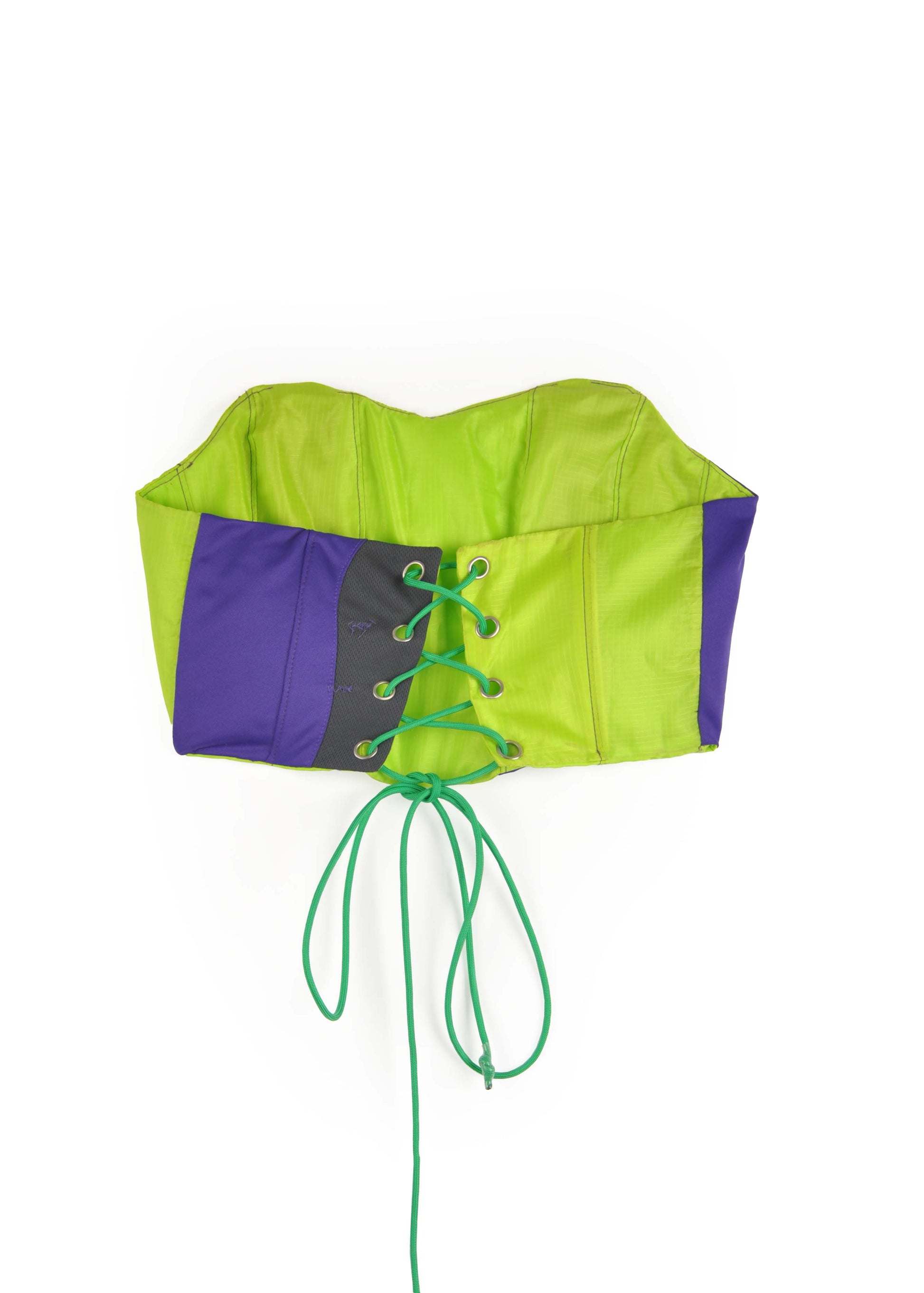Korsett in Limettengrün und Lila. Schnürverschluss hinten. Aus Fallschirmstoff und Trikot gefertigt.