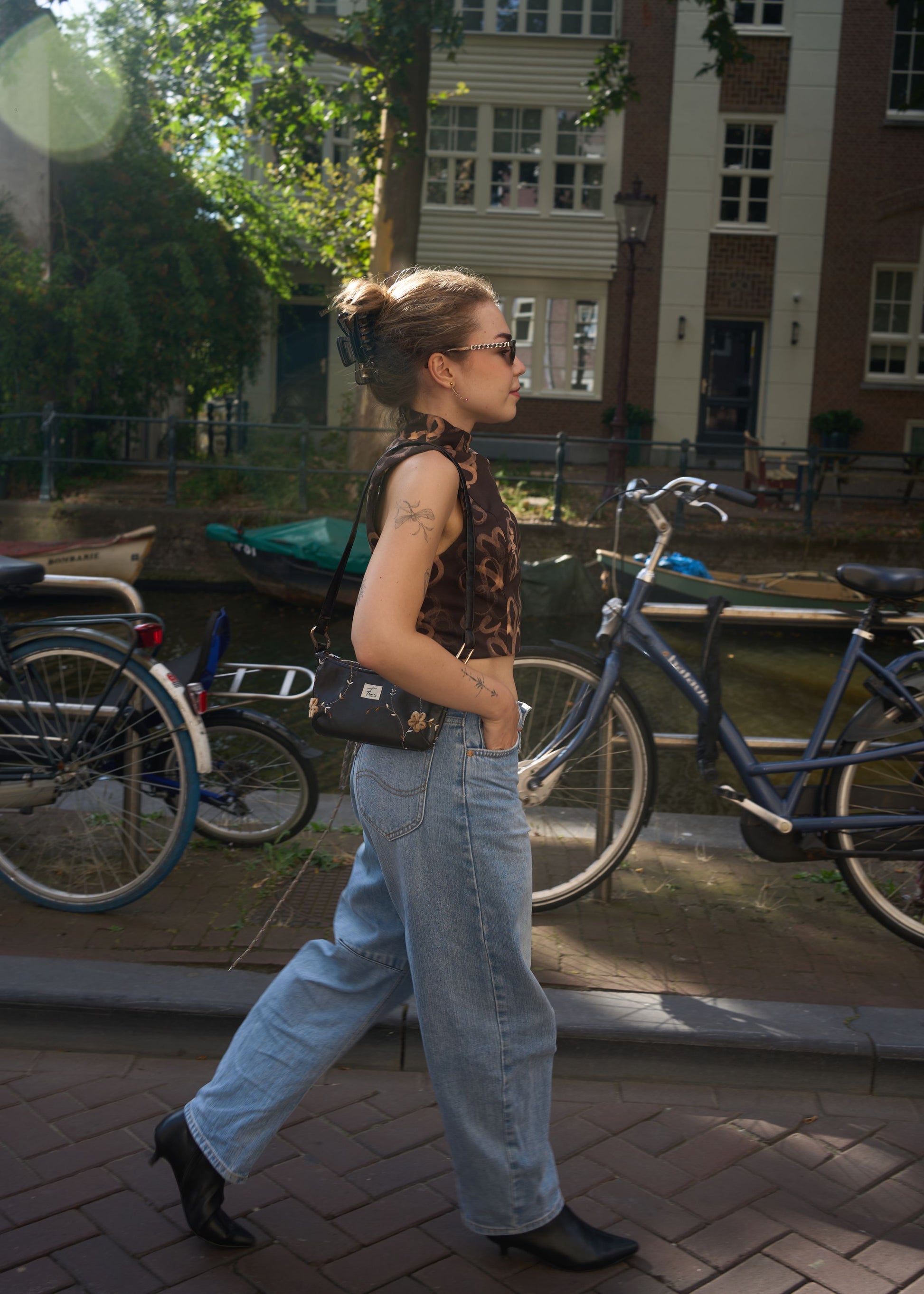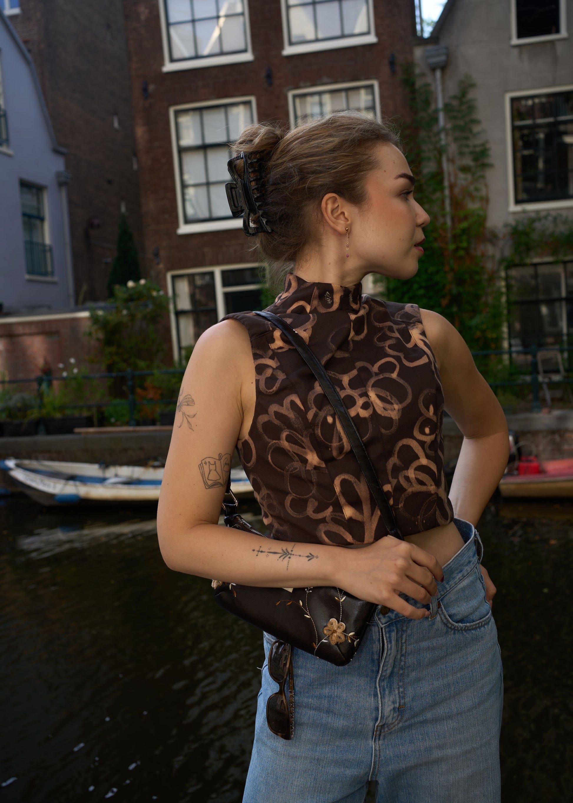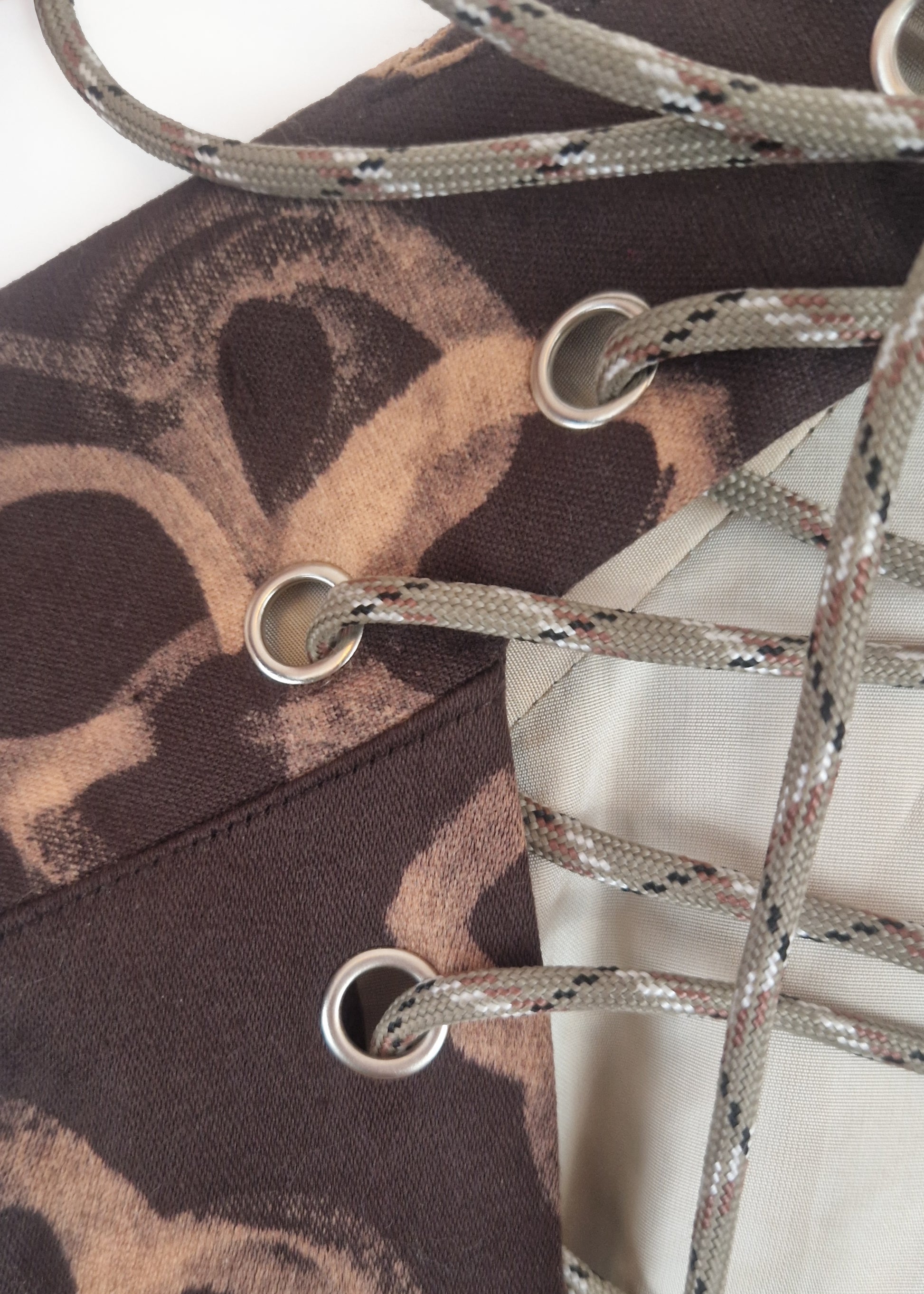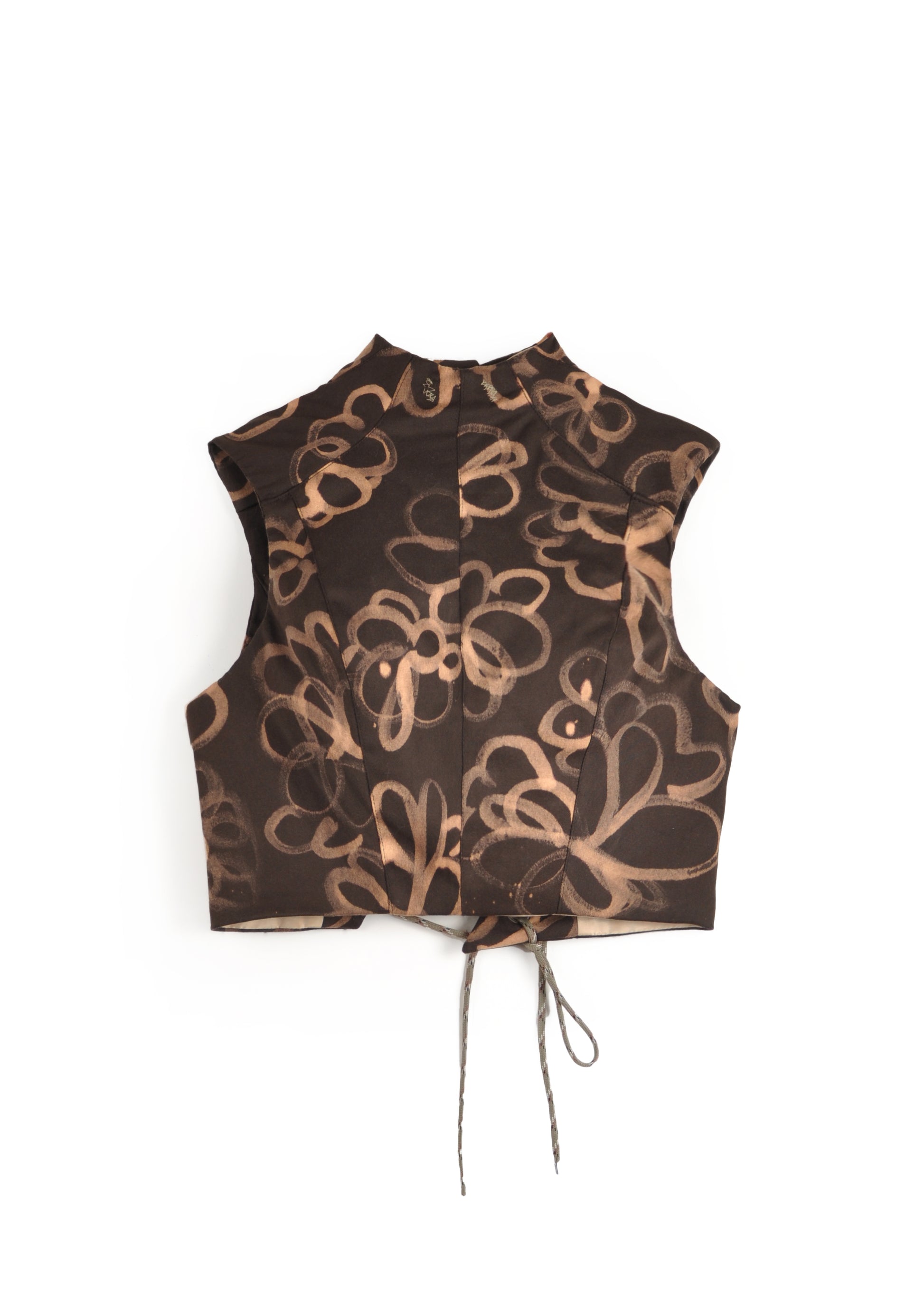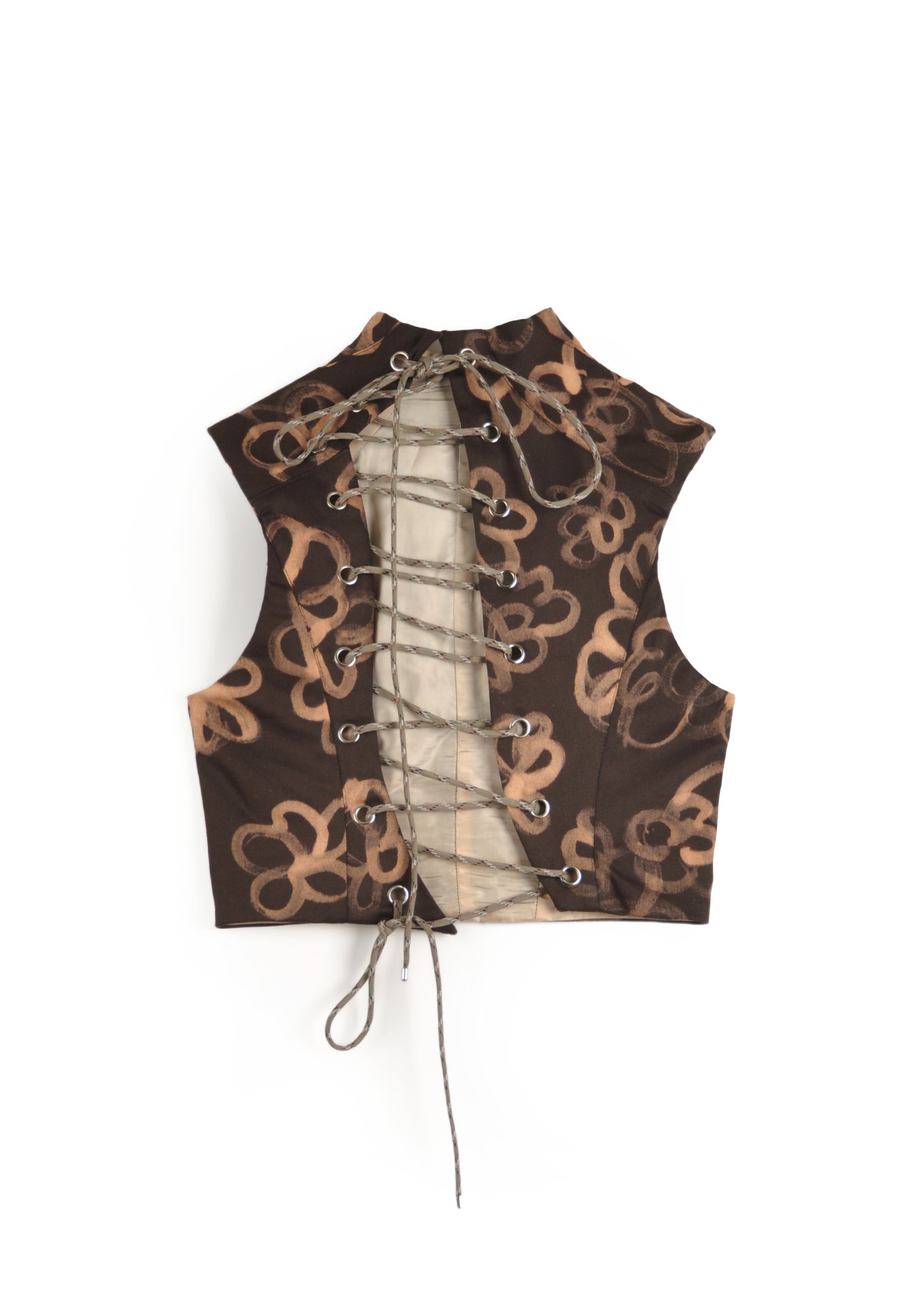 Dieses braune Oberteil ist ein einzigartiges, handgefertigtes Design aus Reststoffen und verleiht überschüssigen Materialien neues Leben. Der Schnürverschluss am Rücken sichert nicht nur das Kleidungsstück, sondern ermöglicht auch subtile Anpassungen der Passform, was für mehr Komfort und Vielseitigkeit sorgt. Mit seiner asymmetrischen Konstruktion, dem gebleichten Blumenmuster und dem nachhaltigen Ansatz ist dieses Oberteil sowohl ein Statement-Piece als auch eine durchdachte Ergänzung für eine moderne Garderobe.