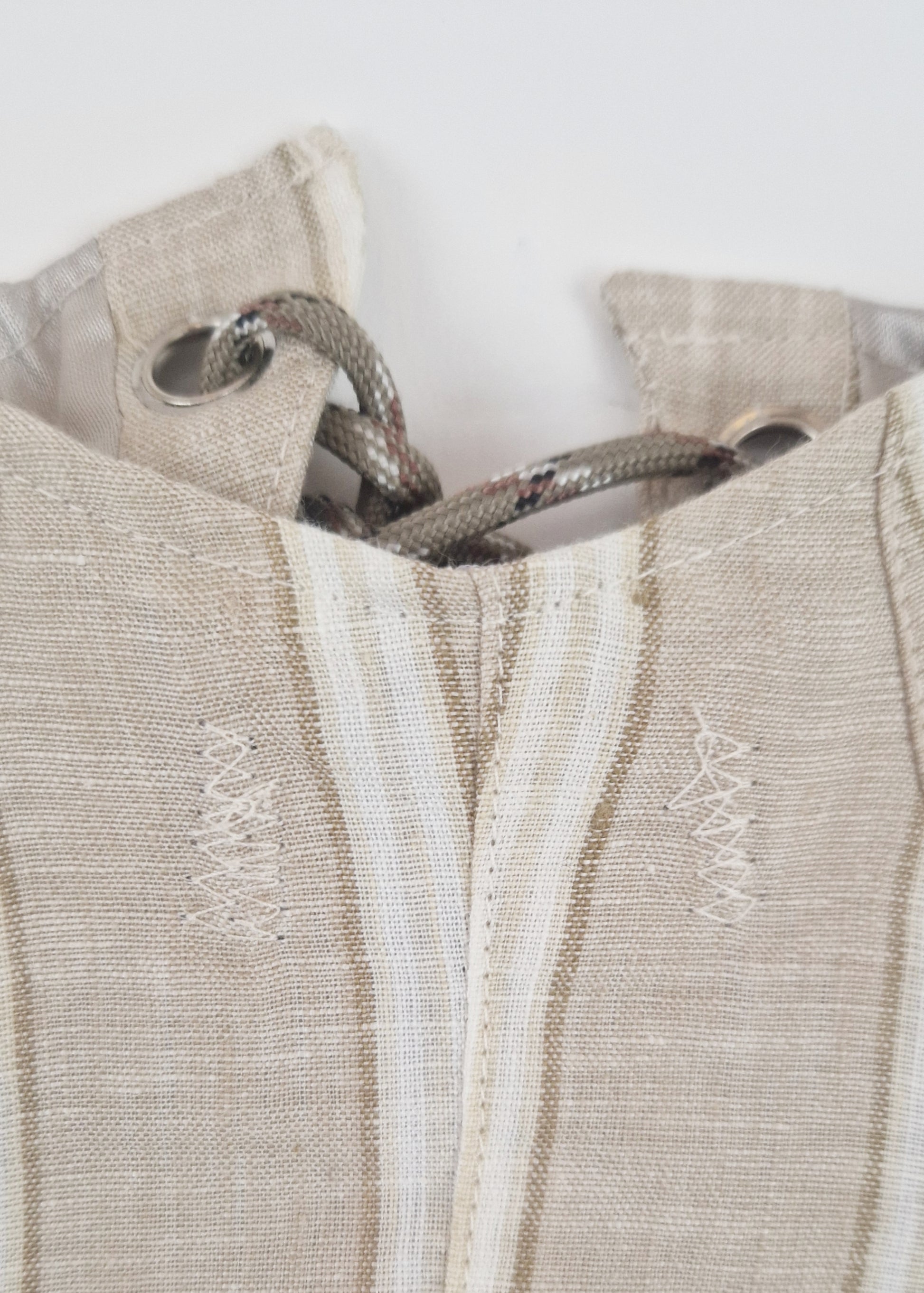 Dieses gestreifte, beige Oberteil ist ein einzigartiges, handgefertigtes Design aus Reststoffen, das überschüssigen Materialien neues Leben einhaucht. Der Schnürverschluss am Rücken sichert nicht nur das Kleidungsstück, sondern ermöglicht auch subtile Anpassungen der Passform und sorgt so für mehr Komfort und Vielseitigkeit. Mit seiner asymmetrischen Konstruktion, dem gebleichten Blumenmuster und dem nachhaltigen Ansatz ist dieses Oberteil sowohl ein Statement-Piece als auch eine durchdachte Ergänzung für eine moderne Garderobe.