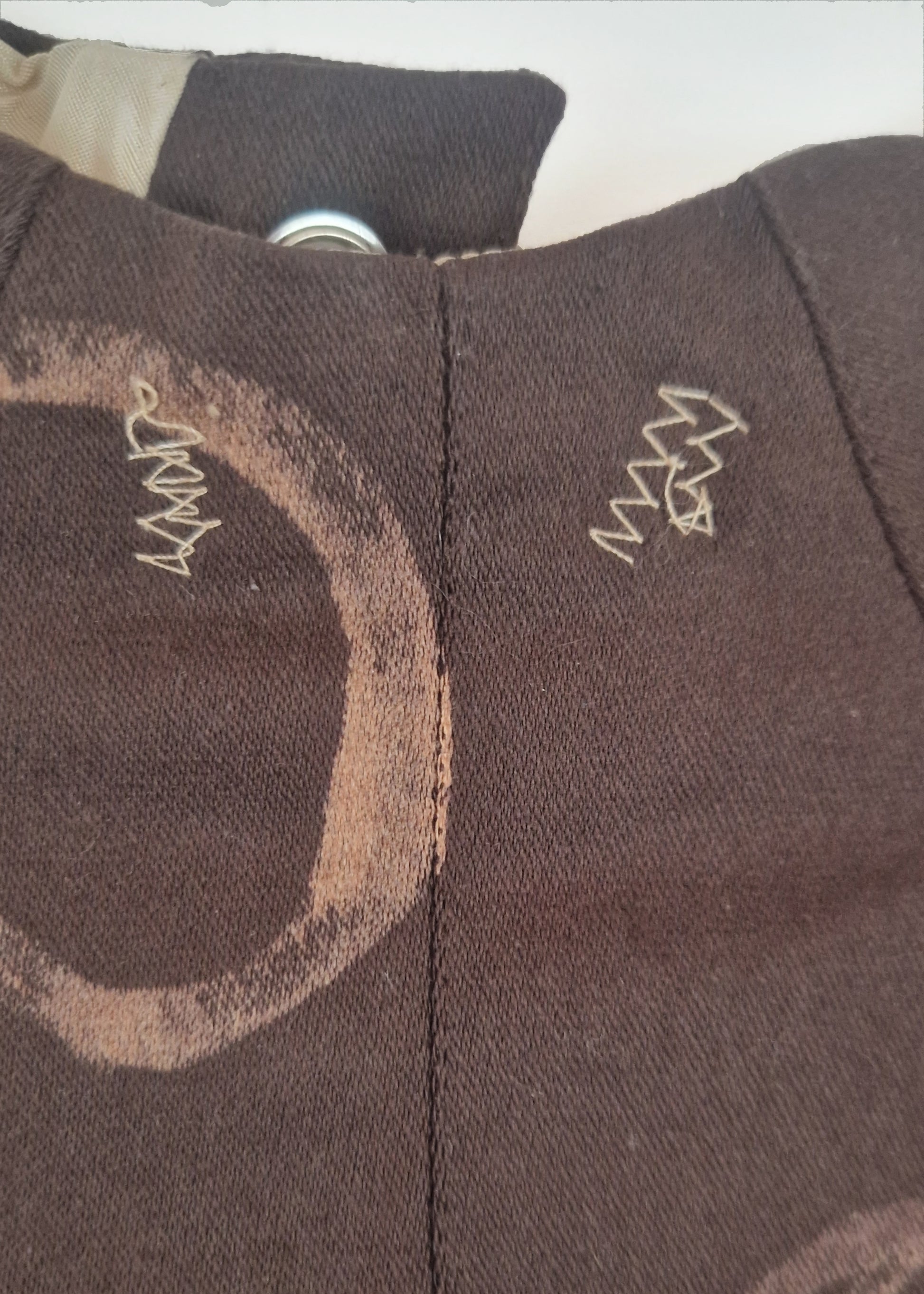Dieses braune Oberteil ist ein einzigartiges, handgefertigtes Design aus Reststoffen und verleiht überschüssigen Materialien neues Leben. Der Schnürverschluss am Rücken sichert nicht nur das Kleidungsstück, sondern ermöglicht auch subtile Anpassungen der Passform, was für mehr Komfort und Vielseitigkeit sorgt. Mit seiner asymmetrischen Konstruktion, dem gebleichten Blumenmuster und dem nachhaltigen Ansatz ist dieses Oberteil sowohl ein Statement-Piece als auch eine durchdachte Ergänzung für eine moderne Garderobe.