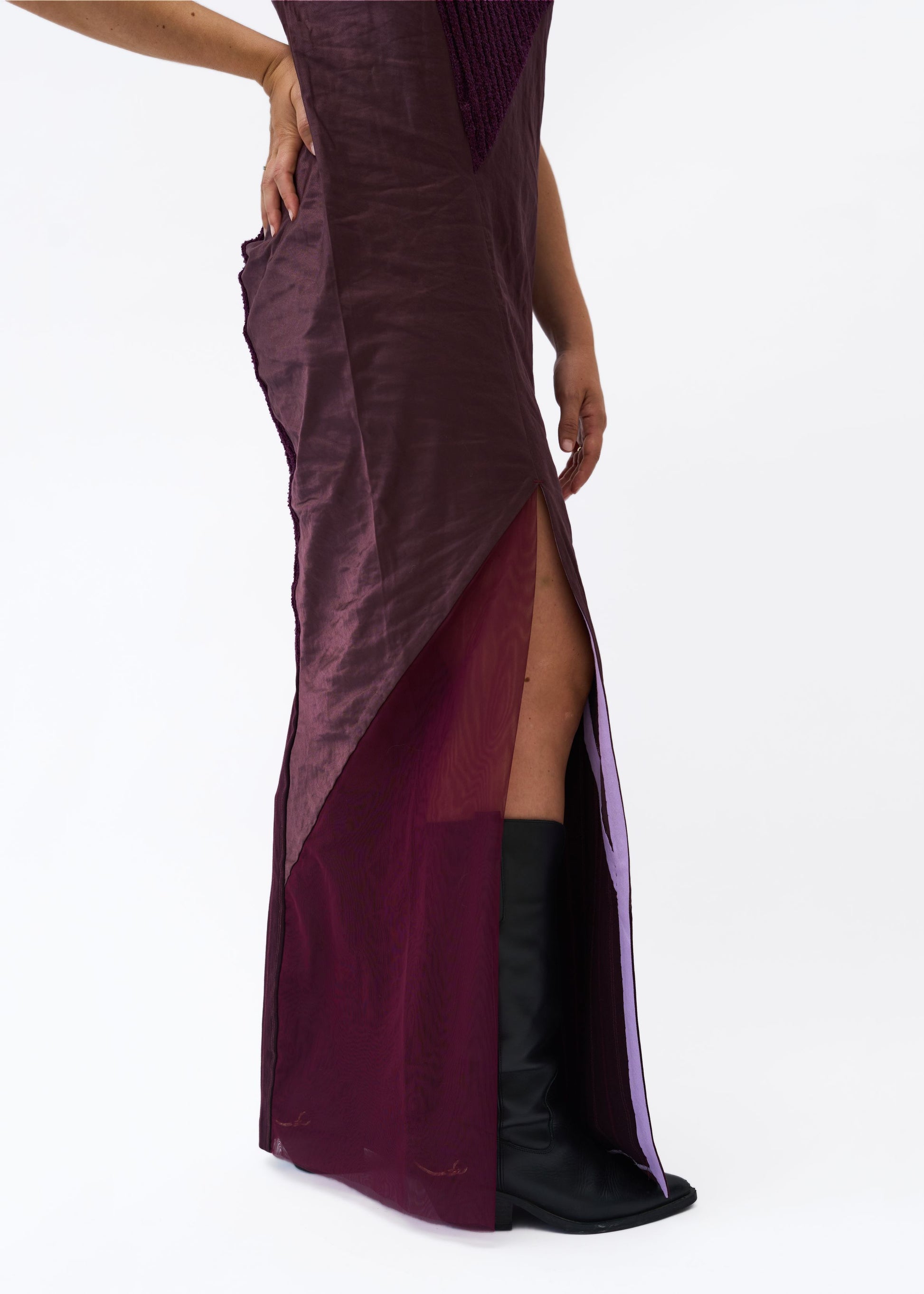 Dieses Kleid ist ein einzigartiges Design, handgefertigt aus Restposten von Stoffen und Garnen. Mit Schlitzdetail.