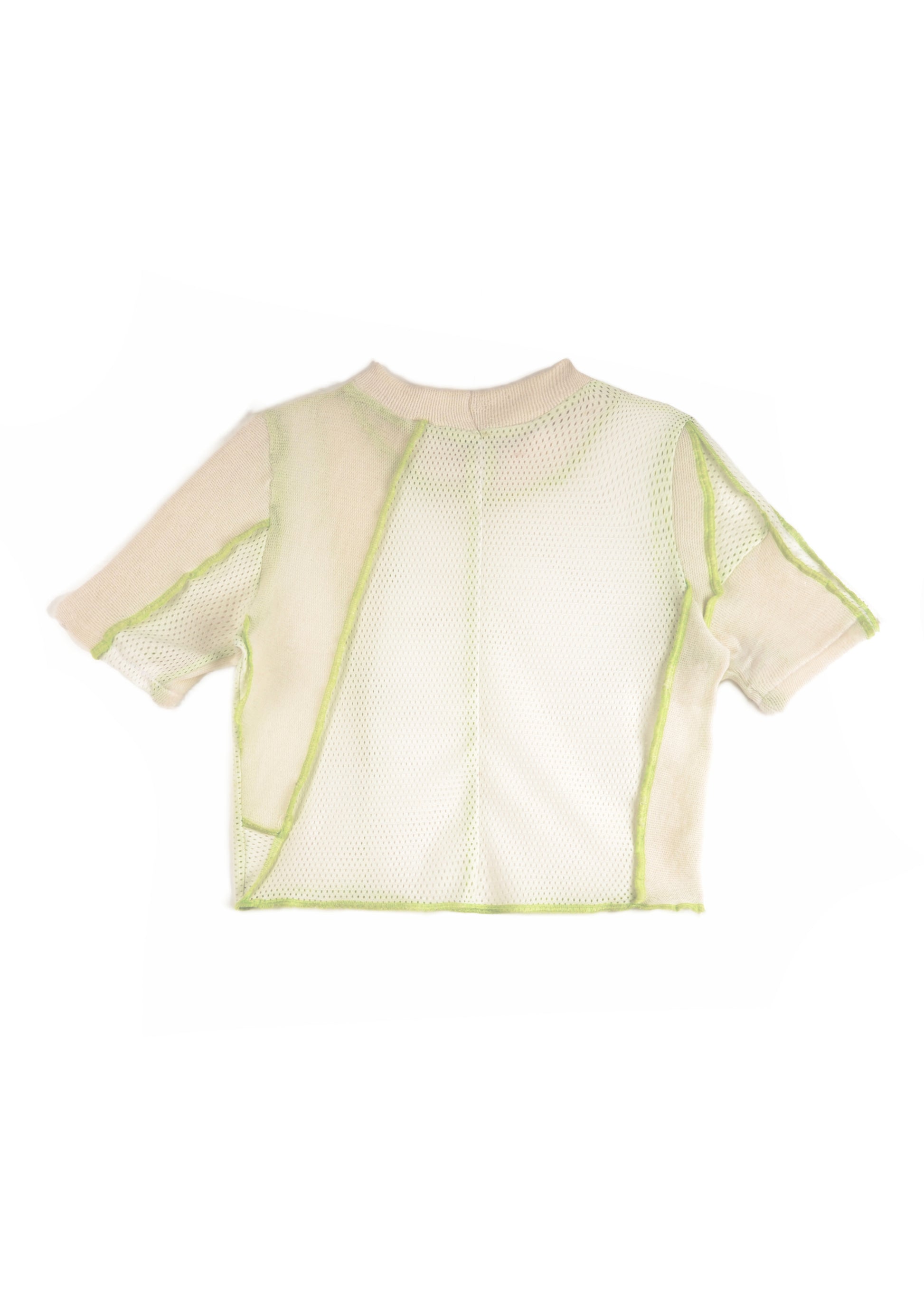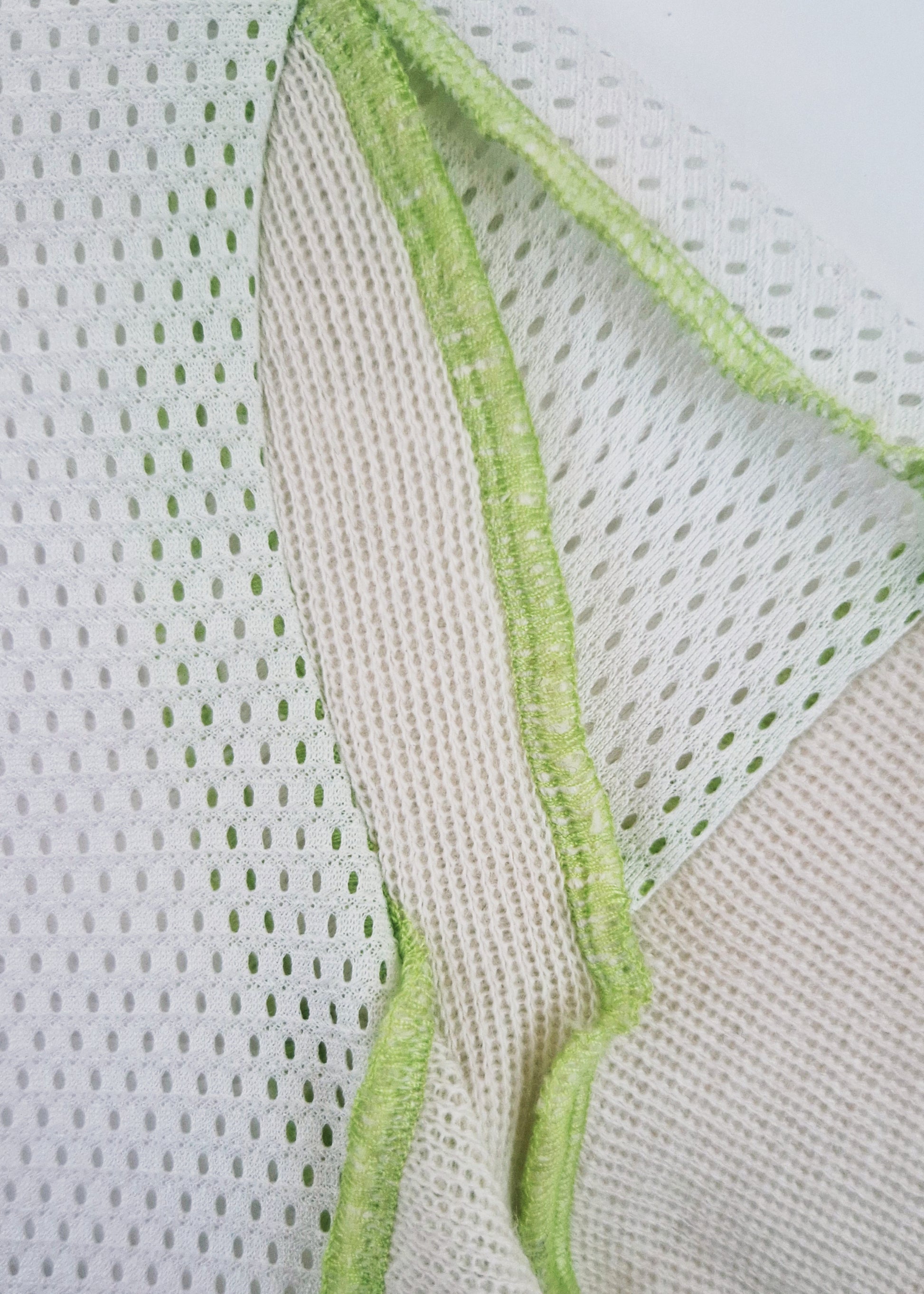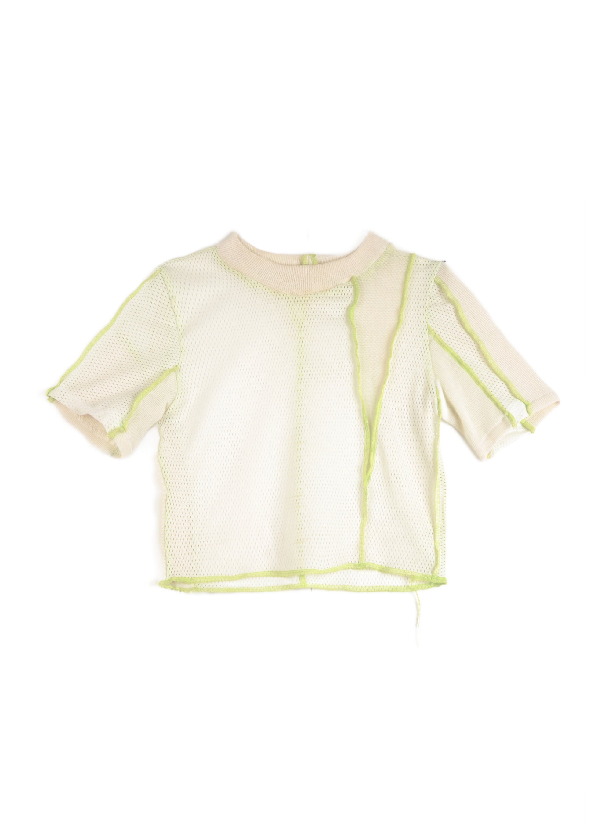 Dieses weiße Hemd mit grünen Overlock-Details ist ein einzigartiges Design, handgefertigt aus Restpostenstoffen.