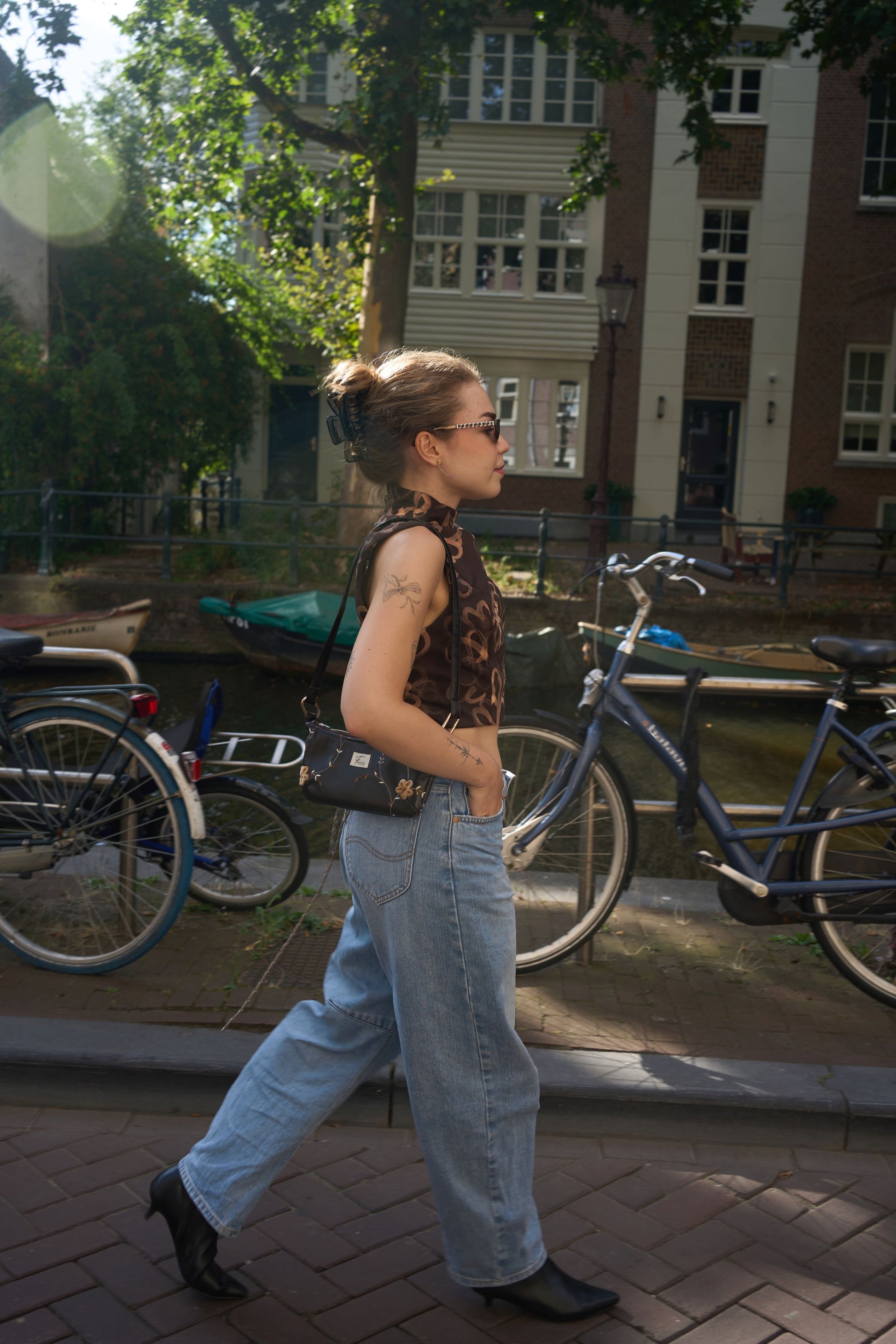 This top is a unique, handcrafted design made from waste fabric, giving new life to surplus materials. The lace-up closure at the back not only secures the piece but also allows for subtle adjustments in fit, ensuring greater comfort and versatility. With its a-symethrical construction, bleached flower patter and sustainable approach, this top is both a statement piece and a thoughtful addition to a contemporary wardrobe.