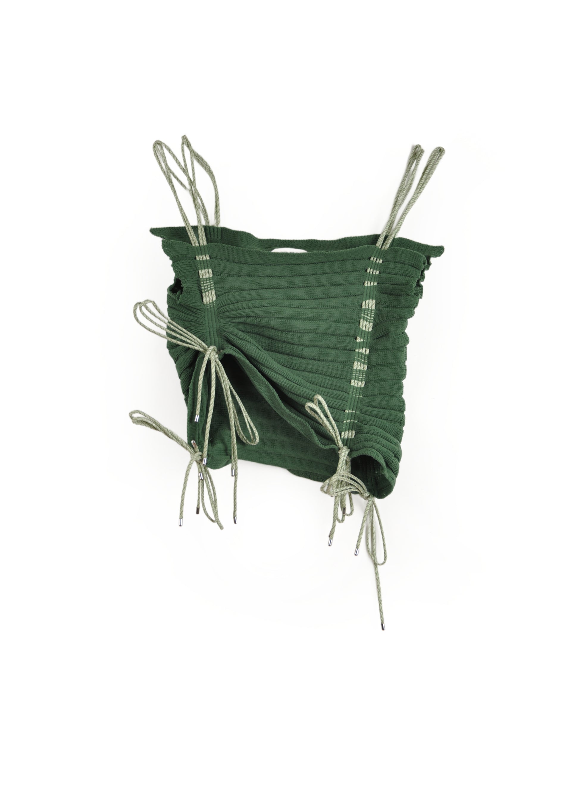 This top is a one-of-a-kind design, handcrafted using deadstock yarn. The knit is adjustable, allowing the length and silhouette to be customized.